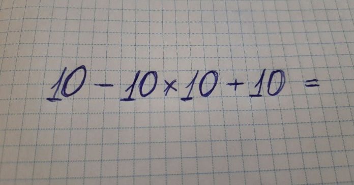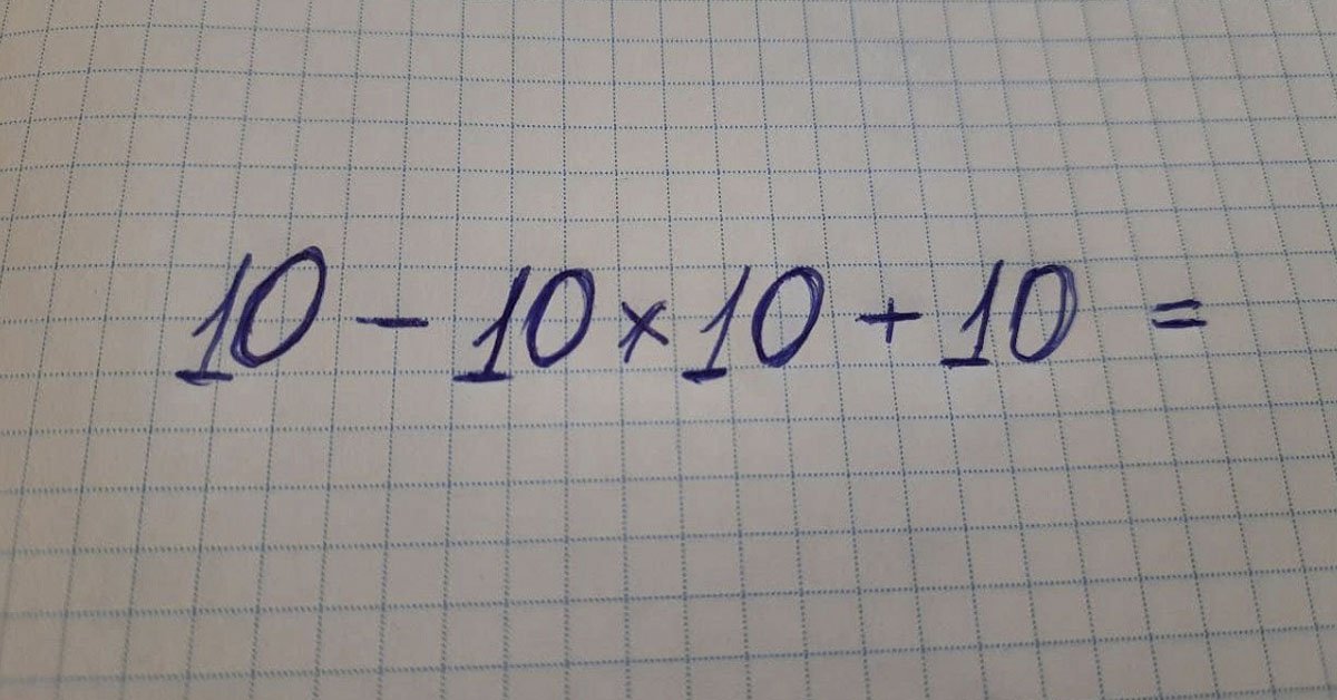 „ვფიქრობ, ყველა, ვინც კომენტარი გააკეთა, მე-4 კლასამდე მაინც მივიდა. მადლობა ღმერთს, რომ ჩავაბარე. 10 − 10 × 10 + 10 = 0 × 10 + 10 = 0 + 10 = 10″