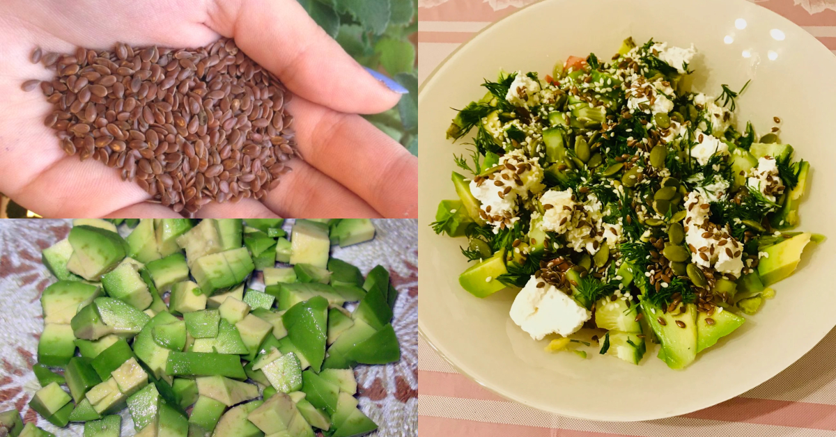 დააყარეთ დაჭრილ ინგრედიენტებს სელის, სეზამის, გოგრის თესლი, მოასხით ზეითუნის ზეთი და ისიამოვნეთ გემრიელი სალათით.