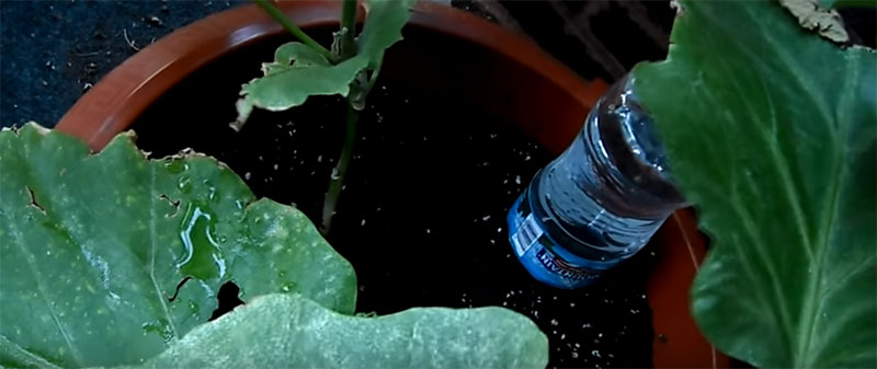 გააკეთეთ ხვრელი თავსახურის შუაში. რაც უფრო წვრილი იქნება, მით უფრო უკეთ იმუშავებს. შემდეგ ამოთხარეთ პატარა ორმო ქოთანში. ბოთლი წყლით მთლიანად აავსეთ, გახვრეტილი თავსახური დააფარეთ და მიწაში თავით ჩაამაგრეთ.